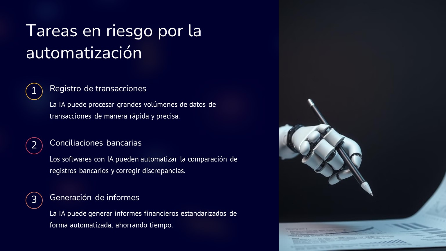 Es cierto que muchas tareas rutinarias, como el registro de transacciones, conciliaciones y generación de reportes financieros, están siendo automatizadas gracias a herramientas avanzadas de IA y software contable. Estas herramientas permiten a las empresas manejar datos con mayor precisión y velocidad.