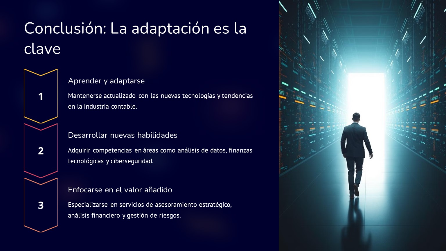 Si bien la IA cambiará la manera en que se realiza el trabajo contable, también abre la puerta a nuevas oportunidades de crecimiento profesional. En lugar de ser reemplazados, los contadores que se adapten y evolucionen con las tecnologías podrán desempeñar un rol aún más estratégico y relevante para las organizaciones.